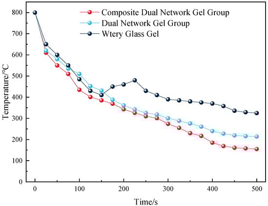 As illustrated in Figure 10, all three types of gels significantly reduced the coal body temperature. However, the water glass gel exhibited a brief temperature rise during the fire prevention process caused by the rekindling of the coal body. This phenomenon is attributed to the water loss and cracking of the water glass gel under high temperatures, which reduces its ability to cover the coal body and isolate oxygen, leading to air leakage and spontaneous combustion. In contrast, the composite dual-network gel demonstrated a notably better cooling effect than both the water glass gel and dual-network gel, reducing the coal body temperature to below 200 °C within 500 s.