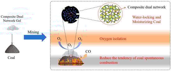 A portion of the gel remains in the cracks, effectively isolating oxygen, while another portion penetrates the fire area and comes into contact with the coal. The dual-network structure enhances the gel’s resistance to destruction and increases its compressive strength, making it less likely to be destroyed after bonding with the coal. This continuous oxygen isolation slows down the coal–oxygen reaction, reducing the likelihood of spontaneous combustion and helping to suppress the ignition of coal.