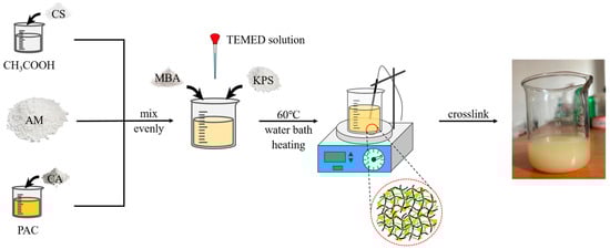 The experimental materials included chitosan (CS) with a deacetylation degree of ≥95%, N,N’-methylenebisacrylamide (MBA), analytically pure; acrylamide (AM), analytically pure; polyaluminum chloride (PAC), industrial grade; glacial acetic acid (CH3COOH), citric acid (CA), potassium persulfate (KPS), and tetramethylethylenediamine (TEMED), all analytically pure.