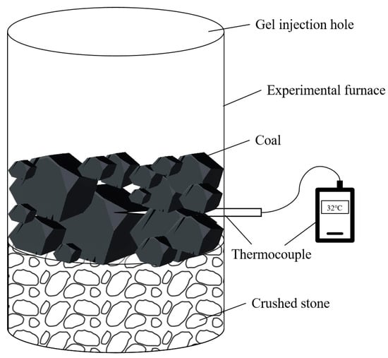 The actual fire-extinguishing effect of the gel was tested using a homemade test device. A coal block was ignited to simulate coal‘s spontaneous combustion. When the coal temperature reached 800 °C, water or gel was injected into the device, and the temperature was recorded every 10 min until it stabilized. The fire-extinguishing effects of water, the double-network gel, and the Al3+ composite double-network gel were then compared. The test device is illustrated in Figure 14. The error of the fire extinguishing test was within the range of 3 °C.