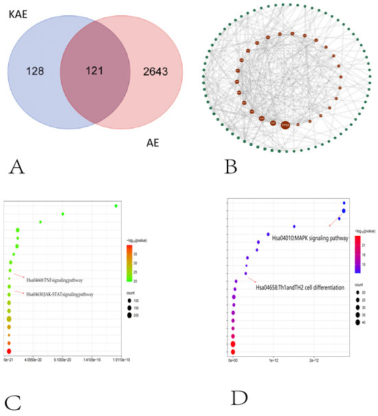 Network pharmacology analysis. (A) Venn plot of the target of the action of KAE with AE. (B) PPI network of drug–disease targets for KAE treatment of AE. (C) Bubble plot for the signal analysis of the GO enrichment analysis of potential targets for KAE treatment of AE. (D) Bubble plot for the signal analysis of the KEGG enrichment analysis of potential targets for KAE treatment of AE.