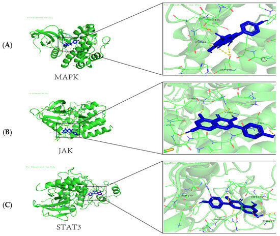 Results of KAE docking with key targets, including (A) MAPK, (B) JAK, and (C) STAT3.