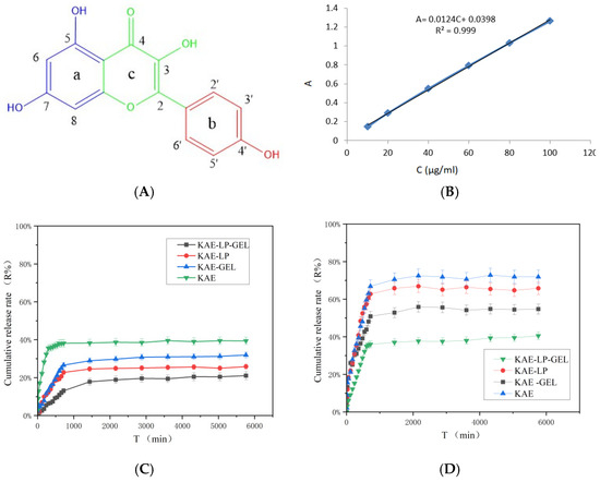 The molecular formula of KAE is C15H10O6, as shown in Figure 3A, which belongs to flavonoids, and its core structure contains multiple phenolic hydroxyl groups (i.e., -OH groups), and these phenolic hydroxyl groups are one of the important moieties for KAE to exert its medicinal effects. In addition, KAE has a diphenylpropane structure, which is also an important structural basis for its medicinal effects. The standard curve was plotted using absorbance (A) as the vertical coordinate and the concentration (C) of KAE as the horizontal coordinate. As shown in Figure 3B, there was a good linear relationship between the KAE concentration and absorbance in the range of 0.01–0.1 mg/mL. In the in vitro release experiments, the cumulative permeability curves of KAE and its formulations were plotted using the cumulative permeability of the drug, “R%”, as the vertical coordinate and the time, “T”, as the horizontal coordinate (Figure 3C,D). During the experiment, the cumulative release of the KAE was the highest, and that of the KAE-LP-GEL was the lowest. This might be due to the fact that free KAE is not restrained by the LPs and hydrogel during drug release. KAE-LP-GEL combined the dual retardation mechanism of the LPs and hydrogel, in which the drug was first encapsulated in LPs and then embedded in the network structure of the hydrogel. This dual carrier structure further prolonged the release time of the drug, resulting in a relatively low cumulative release rate.