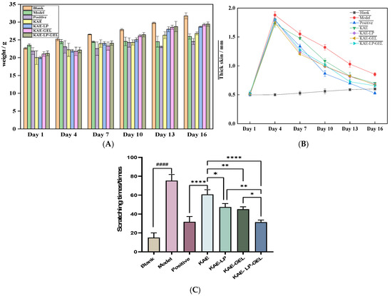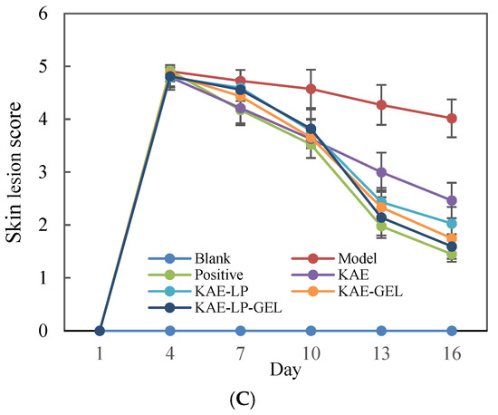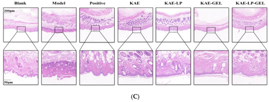 The changes in the bodyweight of the mice during 16 days are shown in Figure 5A. The bodyweight of the mice in the blank group was increasing all the time, indicating that the mice in the blank group were in good physical condition. In the first four days, the bodyweight of the mice in the model group increased only a little because of the stimulation of DNCB, and from day 4 until the end, the mice in the model group basically did not increase in bodyweight. The mice in the positive control group also gained some weight first, then lost weight again because of the eczema model, and then gained weight again because the skin inflammation had been alleviated, but because of the side effects of the compound dexamethasone acetate cream on the skin, the mice in the positive control group became very thin and small, and the final weight was the lightest, and the mice in each drug treatment group kept increasing their weight slowly. Overall, the bodyweight of the mice in the model group was lower compared with that of the mice in the blank group; the bodyweight of the mice in each drug-treated group was heavier compared with that of the mice in the model group, and the bodyweights of the mice in the KAE-LP, KAE-GEL, and KAE-LP-GEL groups were heavier than that of the mice in the KAE group, indicating that KAE-LP, KAE-GEL, and KAE-LP-GEL dosage forms were more effective than free KAE in the treatment of AE mice. The bodyweights of the mice in the KAE-GEL and KAE-LP-GEL groups were heavier than those of the mice in the other groups, which might be because of the hydrogel adhering more to the skin. The changes in the skin thickness on the backs of the mice over 16 days are shown in Figure 5B. On the first day of the experiment, the skin thickness in the seven groups was almost the same. Under DNCB sensitization, the skin thickness of the mice thickened a lot on the fourth day, except for the blank group, where the skin grew thicker naturally because of the increase in the bodyweight. The skin thickness in the other six groups of mice generally increased first and then decreased. The skin thickness of the mice in the model group was higher than that of the mice in the blank group, and the skin thickness of the mice in the positive control group and each drug-treated group with treated eczema skin inflammation was lower than that of the mice in the model group. The treatment effect in the KAE-LP-GEL group was better than those in the KAE-LP and KAE-GEL groups, and the performances in the preparation groups (KAE-LP, KAE-GEL, and KAE-LP-GEL) were better than that in the active-pharmaceutical-substance (KAE) group.
