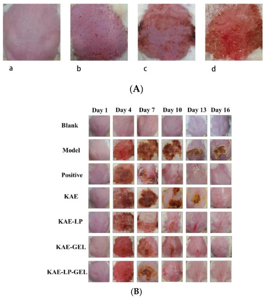 The normal mice had smooth fur, were responsive, and had bright hair, and no abnormal behavior occurred. The skin on the backs of the mice was dehaired in the afternoon of the day before the experiment, and the skin in the dehaired area was undamaged, smooth, and red (Figure 6A(a)) On the first day, 5% DNCB was applied to sensitize the mice, and on the second day, the skin on the backs of the mice showed mild erythema and edema (Figure 6A(b)), and the mice began to scratch and showed irritability and jumping and other behaviors. On the third day, the sensitization was followed, and the skin on the backs of the mice began to ooze and crust (Figure 6A(c)). On the fourth day, the back skin of the mice in the model, positive, KAE, KAE-LP, KAE-GEL, and KAE-LP-GEL groups showed very serious edema, redness, bulging, crusting, and other typical AE skin characteristics (Figure 6A(d)), proving that the modeling was successful; at this time, the mice’s scratching behavior was more serious, and their responses were more sluggish.