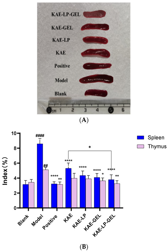 As shown in Figure 7A, compared with the blank group mice, the sizes of the spleen and thymus of the mice in the DNCB-induced AE model group increased significantly, but they decreased in the drug-treated groups after treatment. As can be seen from Figure 7B, compared with the blank group, the indices of the spleen and thymus in the model group increased. The indices of the spleen and thymus in the positive control group and the KAE-LP, KAE-GEL, and KAE-LP-GEL groups decreased significantly after the treatment and were lower than those in the model group. Spleen thymus of mice in the model group compared to the blank group was #### p < 0.0001 and ## p < 0.01, respectively; spleen of mice in the treatment group compared to the model group was **** p < 0.0001. Thymus of mice in the Positive group, the KAE-GEL group, and the KAE-LP-GEL group compared to mice in the model group was ** p < 0.01; ** p < 0.01; * p < 0.05; spleen in KAE group and KAE-LP-GEL group compared to * p < 0.05.
