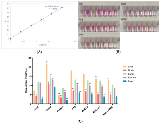 KAE-LP, KAE-GEL, and KAE-LP-GEL all exhibited potent antioxidant inhibition effects of DNCB induction on the MDA content in various tissues of mice. (A) MDA standard curve; (B) color development of the homogenates of the back skin and tissues from each group of mice; (C) MDA contents of skin and tissues from the mice in the different treatment groups compared with those of skin and tissues from the mice in the blank group, ### p < 0.001, and compared with those of skin and tissues from the mice in the model group, *** p < 0.001.