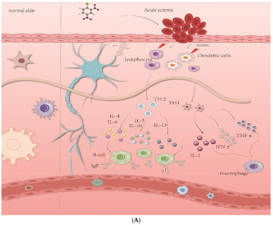 Acute eczema (AE) is an inflammatory skin disease. There are some clinical features, including dryness, itching, and eczema in the skin, accompanied by increased transcutaneous water loss [1,2]. AE involves cytokines expressed in T-lymphocytes, T-helper cell type 1 (Th1) cells, T-helper cell type 2 (Th2) cells, and dendritic cells. Th1 cells secrete interleukin (IL)-2, interferon (IFN), and tumor necrosis factor (TNF) to activate macrophages, while Th2 cells secrete cytokines, such as IL-4, IL-5, IL-6, IL-10, and IL-13, to increase the production of immunoglobulin E (IgE) and induce mast cells and eosinophils to differentiate [3,4]. Th2 cytokines directly affect skin cells. At present, the drugs for treating AE mainly include corticosteroids, antihistamines, and antibiotics. However, they have side effects during long-term use, such as skin atrophy and telangiectasia [5]. Therefore, people have been trying to find safer and more effective plant-derived compounds that can regulate the pathological mechanism of AE.