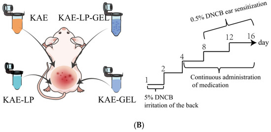 The AE model was established by referring to the method in [32] with some slight modifications. The mice were kept in the animal room for three days before modeling to adapt to the new environment and the experimental progress for establishing the DNCB-induced eczema mouse model and drug treatment, as shown in Figure 9A. One day before the experiment, mouse hair was removed from the backs of the mice with an electric hairdresser and hair removal cream, and the hair on the back of each mouse was shaved into a block 3 cm wide × 3 cm long. All the groups of mice except the mice in the blank group were sensitized by applying 100 μL of 5% DNCB to the dorsal hair removal site and sensitized on days 1 and 2. After the first induction, the mice were kept normally. After five days, the 0.5% DNCB solution was applied to the skin of the ear for re-sensitization, which was performed every three days and required sensitization three times, and the mice in the blank group were coated with equal amounts of acetone solvent. On day 4, all the mice were treated with PBS, compound dexamethasone acetate cream, KAE, KAE-LP, KAE-GEL, or KAE-LP-GEL, once daily for 12 days of administration, as shown in Figure 9B. If sensitization occurred on the same day, the drug was administered 2 h before the sensitization. Then, 24 h after the end of the last treatment, the mice were anesthetized using an intraperitoneal injection of 20% ethyl carbamate (0.2 mL/20 g), and the right and left ears, organ tissues, and dorsal skin were collected for subsequent testing.