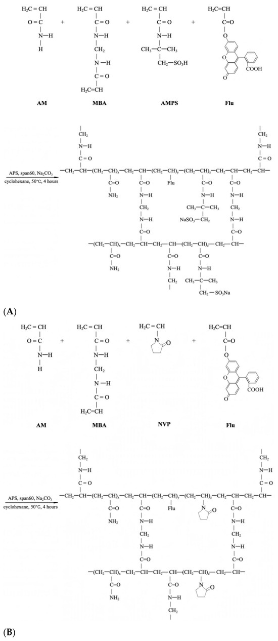 - Kang, W.; Hu, L.; Zhang, X.; Yang, R.; Fan, H.; Geng, J. Preparation and performance of fluorescent polyacrylamide microspheres as a profile control and tracer agent. Pet. Sci. 2015, 12, 483–491. [Google Scholar] [CrossRef]