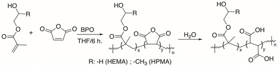 P(HEMA-alt-MAn) and P(HPMA-alt-MAn) were synthesized by free radical copolymerization (1:1 feed monomer ratio) in solution using 0.5 mol% of BPO in tetrahydrofuran (THF). The polymerization reaction was kept at 70 °C for 6 h (see Table 1).