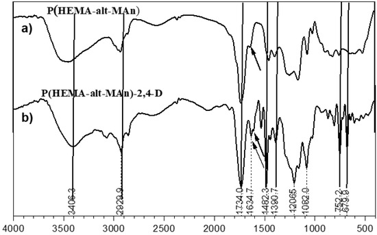 (a) FTIR spectrum of P(HEMA-alt-MAn) and (b) its copolymer conjugate 2,4-D.