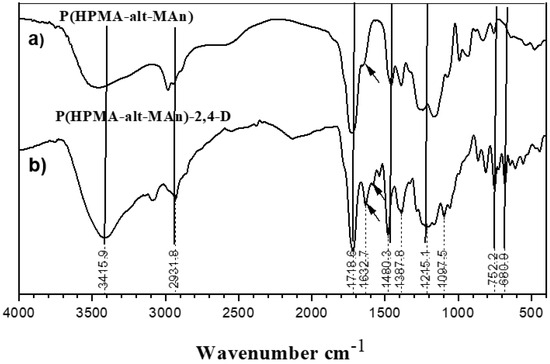 FTIR (KBr, cm−1) of P(HEMA-alt-MAn)-2,4-D exhibited the following signals: 3406.3 ν(OH); 2929.9 ν(CH, CH2); 1734.0, 1634.7, and 1616.3 assigned at ν(C=O, ester from MAn, HEMA-2,4-D, respectively), and an increase in signal intensity was observed, along with a slight shift towards a shorter wavenumber; and 1482.3 and 1390.7 ν(CH2-; CH3-); and 752.2 and 679.9 ν(C=C, aromatic ring) from herbicide; see Figure 3b. FTIR (KBr, cm−1) of P(HPMA-alt-MAn)-2,4-D: 3415.9 ν(OH); 2931.8 ν(CH, CH2); 1781.1, 1632.8, and and 1622.6 assigned at ν(C=O, ester from MAn, HPMA-2,4-D, respectively), and an increase in signal intensity was observed, along with a slight shift towards a shorter wavenumber; 1480.3 and 1387.8 ν(CH2-; CH3-); 752.2 and 680.9 ν(C=C, aromatic ring) from herbicide; see Figure 4b [9,50,51].