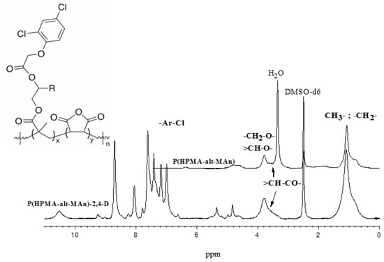 1H-NMR (δ in ppm) showed the following signals: 0.3–2.2, [-CH3, -CH2 from backbone of HEMA], 2.6–5.4 [-CH-CO- of MAn], [-CH2-O- from lateral chain of HEMA], and 6.4 [-OH lateral chain]. On the other hand, the characterization of the P(HPMA-alt-MAn) by 1H-NMR (δ in ppm) showed the following signals: 0.6–1.6, [-CH3, -CH2 from backbone, and -CH3, of lateral chain of HPMA] and 3.4–4.2 [−CH2-O, and -CH-O- from HPMA and -CH-CO- from MA]; see Figure 5. The 1H-NMR spectrum (δ in ppm) of P(HPMA-alt-MAn)-2,4-D exhibited the following signals: 0.6–1.2, [-CH3, -CH2 from backbone of HEMA], 3.6 [-CH-CO- of MAn], 4.16 [-CH2-O- from lateral chain of HPMA], 4.83–4.93 [-CH2O-Ar from 2,4-D unit], and 6.8–7.7 [-CH aromatic ring from the herbicide, 2,4-D]; see Figure 5 [9,50,51].