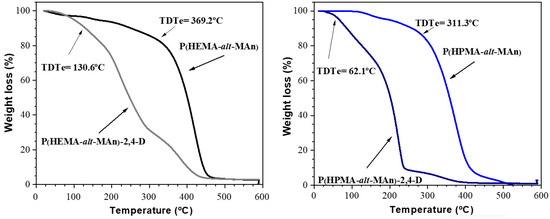 Thermograms of P(HEMA-alt-MAn) and its conjugate P(HEMA-alt-MAn)-2,4-D (left), and P(HPMA-alt-MAn) and its conjugate P(HPMA-alt-MAn)-2,4-D (right). Heating rate, 10 °C min−1, in inert environment (gaseous N2).