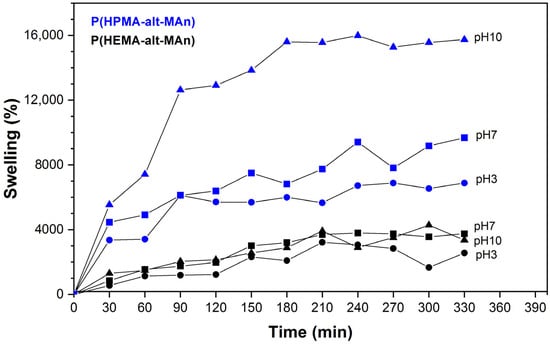 The swelling behavior of P(HEMA-alt-MAn) and P(HPMA-alt-MAn) copolymers were studied based on their behavior at different pH levels by immersing the gels in buffered solutions at different pH values (3, 7, and 10), all at 25 °C. The results, displayed in Figure 7, show the swelling times corresponding to each condition.
