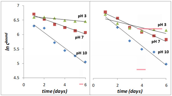 The kinetic constants for the various systems at different pH values were obtained from the slopes of the plots shown in Figure 10, as indicated by Equation (9). These values are presented in Table 1. The exponential decay observed in the release profiles confirms that the hydrolysis of the copolymer conjugates follows first-order kinetics. It can be seen in Figure 8 the evolution of ln c bound-day with time during the first 6 days.