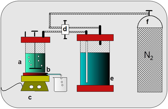 Experimental set-up of ultrafiltration system: (a) filtration cell, (b) filtrate, (c) magnetic stirrer, (d) selector, (e) reservoir, and (f) pressure source.