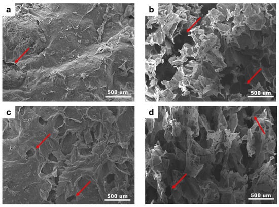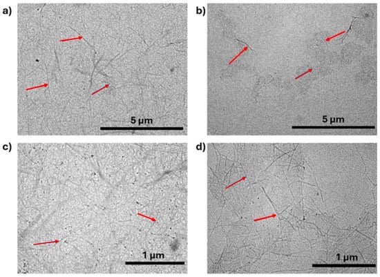 Banana peduncles produce CNF, shown by red arrows, and nanocrystalline cellulose (CNC), shown by blue arrows, through alkaline hydrolysis and bleaching treatment, as seen in the TEM images in Figure 3a–d. CNCs form primarily through the mechanical treatment of ultrasonication, which is a process that involves the application of high-frequency sound waves to break down cellulose fibers into smaller, more uniform particles. Both CNC and CNF are utilized in the fabrication of aerogels. However, CNF is generally more appropriate for most foam and aerogel applications because of its greater flexibility, fibrous structure, and capacity to form a robust 3D porous network upon dehydration [41].