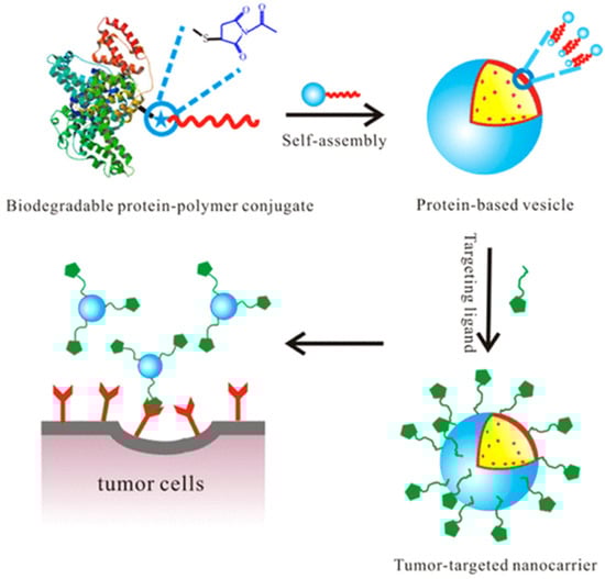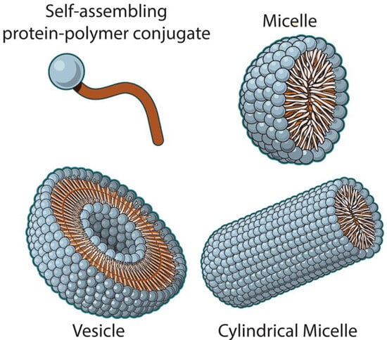 The conjugation of a hydrophobic polymer with a hydrophilic protein produces an amphiphilic protein–polymer conjugate. Amphiphilic block copolymers can self-assemble into various organized structures. This self-assembled protein can serve as an excellent tunable device of drug delivery that can be designed for temporal and distribution control. Currently, amphiphilic block copolymer protein–polymer conjugates which show great promise are the focus of advanced drug delivery methods. These bioconjugates can be designed to connect hydrophobic polymer to a hydrophilic protein in order to achieve amphiphilicity. These amphiphiles have the ability to self-assemble into a variety of higher-order structures, including micelles, vesicles, and bilayers (Figure 1). Self-assembled protein–polymer conjugates have clear advantages over their monomeric counterparts in drug administration, including distribution management, timing control, and drug encapsulation. Self-assembled protein–polymer conjugates can decrease toxicity, allow sustained release, protect hydrophobic medicines from hydrolysis and other enzymatic or chemical destruction, and increase their bioavailability [2].