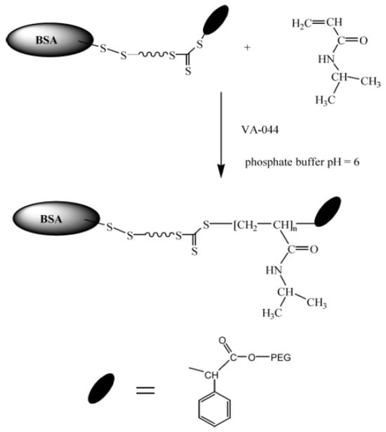 BSA-poly (NIPAAm) conjugation. This figure illustrates the synthesis of a BSA-poly (NIPAAm) conjugate via aqueous RAFT polymerization. The BSA acts as a macroRAFT agent, enabling direct polymer growth from its surface. Applications include responsive hydrogels and smart drug delivery systems that exploit the thermal behavior of NIPAAm-based polymers [13].