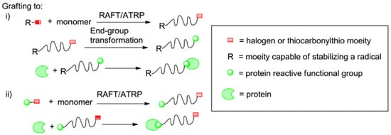 It is the most widely used conjugation method. This technique obtains the conjugate by connecting the polymer with a previously synthesized functional end group and the complementary functional group on the biomacromolecule under appropriate reaction conditions. High yields are expected from this reaction [11]. It requires the post-polymerization modification of the polymers’ end group (Figure 6):