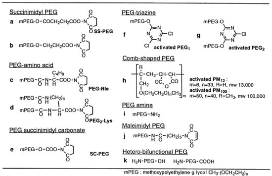 - Kodera, Y. Pegylation of proteins and bioactive substances for medical and technical applications. Prog. Polym. Sci. 1998, 23, 1233–1271. [Google Scholar] [CrossRef]
