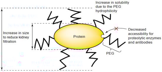 There are numerous benefits that PEGylation conjugation provides, which makes it a preferred method in many biomedical applications (Figure 11). PEG carries its physicochemical properties to the peptide or nonpeptide molecule to which it is attached, thus changing the biodistribution and solubility properties of that substance. The molecular size of the polypeptide is increased, and as a result, its renal ultrafiltration is reduced, as well as increasing the solubility and reducing (or even eliminating) protein immunogenicity [22].