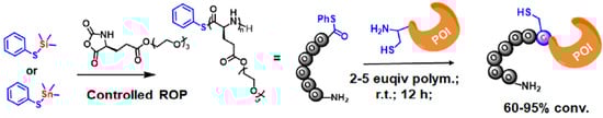 In addition to PEGylation, researchers developed other methods of protein–polymer conjugation. They aim to devise conjugation techniques that produce bioreactive conjugates with tunable characteristics suitable for various applications. One approach is site-specific conjugation, where free Cysteine residues (i.e., Cysteine residues not involved in disulfide bonds) are targeted for a reaction with semi-telechelic polymers. This type of functional polymer is prepared using sulfhydryl-reactive initiators. One example is the technique developed by Bontempo et al. [23], which can be summarized as follows (Figure 12):