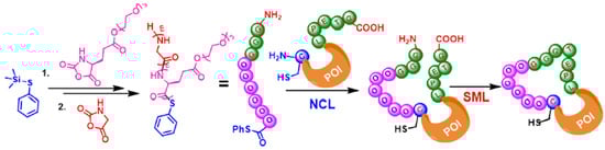 - Qi, Y.; Amiram, M.; Gao, W.; McCafferty, D.G.; Chilkoti, A. Sortase-Catalyzed Initiator Attachment Enables High Yield Growth of a Stealth Polymer from the C Terminus of a Protein. Macromol. Rapid Commun. 2013, 34, 1256–1260. [Google Scholar] [CrossRef]