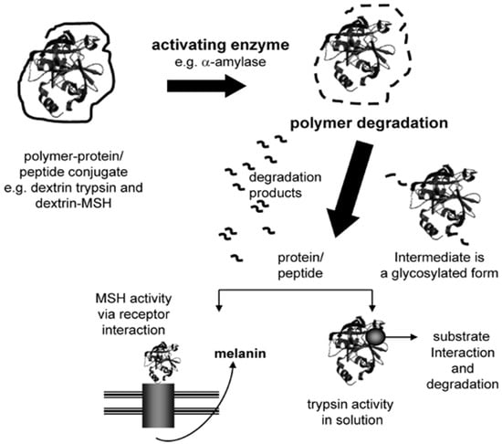 - Duncan, R.; Gilbert, H.R.P.; Carbajo, R.J.; Vicent, M.J. Polymer masked-unmasked protein therapy. 1. Bioresponsive dextrin-trypsin and -melanocyte stimulating hormone conjugates designed for α-amylase activation. Biomacromolecules 2008, 9, 1146–1154. [Google Scholar] [CrossRef]