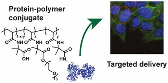 As solitary materials, proteins are a remarkably versatile component in various biomedical applications. Proteins exhibit outstanding biological and economic advantages [1]. In addition to their impressive capability to perform various biological functions, proteins have a high reaction specificity, minimizing their off-target influence. Still, some practical drawbacks limit proteins’ biomedical use. The magnitude and amphiphilicity of proteins may preclude their access to the targeted cell. Also, protease and degrading chemicals may shorten their life span [1,2]. Conjugating proteins and polymers are a highly efficient approach to circumventing complications. The conjugation process transfers the properties of the conjugated polymer to the protein, thus improving its efficiency.