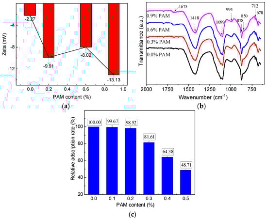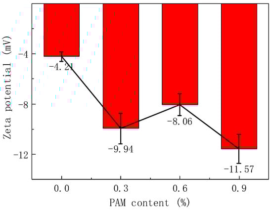 To investigate the specific behavior of PAM gel in cement slurries, zeta potential tests were conducted on cement pastes with varying PAM contents. As shown in Figure 1, all cement pastes exhibited negative zeta potential values. This is because positively charged ions like Ca2+ and Al3+ from cement particles dissolve into the aqueous solution, resulting in an abundance of silicate anions on the surface of cement particles and exhibiting negative charge characteristics. When the PAM content was 0.0%, the zeta potential of the cement paste was measured at −4.21 mV, which was lower than that of traditional cement paste [22]. This reduction in zeta potential can be attributed to the electrostatic adsorption of polycarboxylate superplasticizer molecules on the surface of cement particles. These molecules neutralize some of the surface charges, weakening the electrical properties and decreasing the absolute value of the zeta potential. Zeta potential serves as an essential indicator of colloidal stability. Higher absolute values indicate greater stability, while values closer to zero suggest a tendency for particles to aggregate. In this case, the decrease in the slurry’s zeta potential leads to the sedimentation of cement particles, resulting in observable macroscopic phenomena such as bleeding and segregation, which align with practical observations.