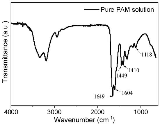 Figure 2 illustrates the FTIR results of a pure PAM solution, where specific peaks are marked at 1649 cm−1, 1449 cm−1, 1410 cm−1, and 1118 cm−1. As mentioned in Section 2.1, the primary functional group in PAM molecules is the -CO-NH2 group. The stretching vibration of the C=O bond in the -CO-NH2 group appears prominently at 1649 cm−1 [25,26]. The in-plane oscillation of the amine group (-NH2) is observed at 1118 cm−1, while the bending vibration of the N-H chemical bond in the amine group is represented by the peak at 1604 cm−1 [25]. Furthermore, distinct peaks at 1449 cm−1 and 1410 cm−1 are observed in the FTIR spectrum. According to research [6], these peaks correspond to the symmetric stretching vibration of the characteristic functional group COO-. This suggests that non-ionic polyacrylamide undergoes hydrolysis in an aqueous solution, resulting in the formation of carboxylic acid functional groups, as indicated in Figure 3.