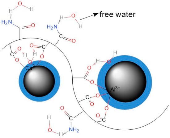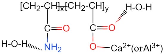 Based on the findings, nonionic PAM in the cement slurry exhibits two types of interactions: chelation and hydrogen bonding. The chelation mainly occurs between the -COO- functional groups of PAM and metal cations, such as Ca2+ and Al3+. This leads to the adsorption of the long-chain structure of PAM onto the surface of cement particles, while hydrogen bonding interactions take place between the -COO-/-NH2 and water molecules. These interactions contribute to a reduction in the fluidity of the material, as evidenced by decreased water flow properties. The chemical interactions involving PAM in the cement slurry can be represented by the diagram shown in Figure 5. Combined with the previously established physical bridging interactions between large polymer chains, it forms the primary adsorption form of nonionic PAM in the cement paste suspension.