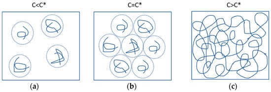 Polymer solution concentrations greater than, equal to, and less than critical concentration: (a) c < c*; (b) c = c*; (c) c > c*.