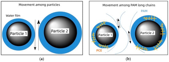 In the absence of PAM, the flow of cement slurry primarily involves the movement of cement particles, with a water film covering the particle surfaces to reduce hindrance and ensure overall fluidity, as depicted in Figure 9a. However, once PAM is introduced, the adsorption process reduces the available free-water volume in the slurry. This limits the water film and also adds constraints to particle movement through bridging effects. Consequently, the interparticle movement decreases significantly. When PAM reaches the saturation adsorption point, due to competitive adsorption between polymer molecules, the cement surface is completely covered by PAM or PCE molecules, along with the adsorbed water molecules. This tremendously restricts interparticle movement; the movement within the cement slurry transforms into the relative motion of high-molecular-weight polymers in the interstitial fluid [31], as depicted in Figure 9b. Within this range, PAM exhibits lubricating properties, and its addition leads to a slight increase in cement slurry fluidity and a corresponding decrease in plastic viscosity.