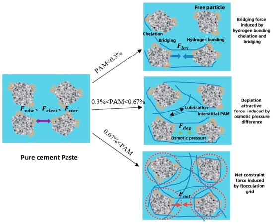 Under the influence of polycarboxylate superplasticizers, the forces between particles in cement slurry mainly consist of van der Waals forces, electrostatic attraction, and steric hindrance forces. After the addition of PAM to the cement slurry, due to the presence of its coagulation-forming action, it exhibits the “adsorption–lubrication–entanglement” action at different PAM concentrations. Among them, the adsorption bridging action of PAM can be represented by the so-called adsorption bridging force .