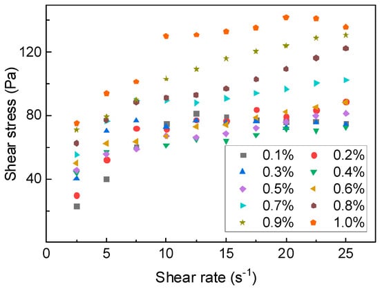 The rheological curve of anti-dispersive CSA cement is presented in Figure 11. It can be observed that the addition of PAM gel induces similar rheological characteristics in sulfate aluminate cement as in ordinary Portland cement. Specifically, the presence of PAM in the slurry causes significant shear-thinning behavior, which gradually weakens with increasing PAM content. Shear thinning occurs as the bonds between material products and the floc-like structure are disrupted during shearing. On the other hand, PAM in the neat slurry can adsorb water molecules and particles or undergo molecular entanglement during shearing. This process results in the continuous destruction and reformation of the internal structure of the suspension. As the PAM content increases, this restorative effect becomes more prominent, leading to an increase in the yield pseudoplastic index.