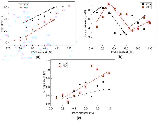 Rheological parameters between CSA and OPC cement under PAM: (a) yield stress; (b) plastic viscosity; (c) pseudoplastic index.