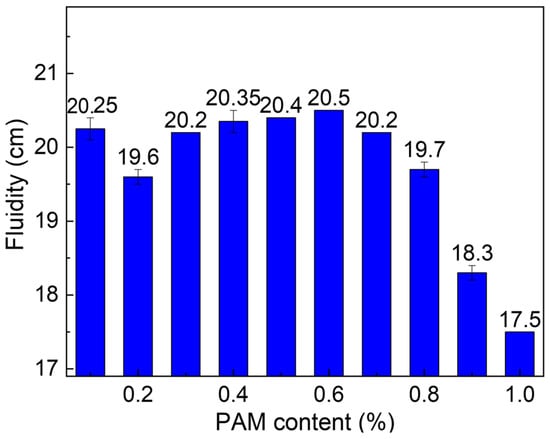 The variation curve of fluidity in sulfate aluminate cement slurry at different PAM contents is depicted in Figure 13. It is evident that the fluidity of the cement slurry follows a pattern of initial decrease, subsequent increase, and then decrease again as the PAM content increases. When the PAM content is less than 0.2%, the fluidity decreases from 20.25 cm to 19.6 cm with increasing PAM content. In the range of 0.2% < PAM < 0.6%, the fluidity of the cement slurry increases from 19.6 cm to 20.50 cm. For PAM content exceeding 0.6%, the fluidity decreases from 20.50 cm to 17.5 cm. The trend of fluidity variation and the critical content points align closely with the values of plastic viscosity.