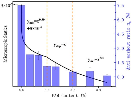 After adding PAM to the cement slurry, due to the presence of adsorption bridging forces, the adsorption interactions between particles first balance the repulsive effects caused by steric hindrance, and then, the forces between particles start to be dominated by adsorption. Although the exact magnitude of the adsorption force is difficult to calculate, it is clear that PAM primarily adsorbs on the surface of cement particles through hydrogen bonding and complexation, bridging multiple cement particles together. These various adsorption interactions are mutually cross-coupled, resulting in the increment of the adsorption bridging force being greater than the single power of the actual adsorption amount of the particle, i.e.,. Through total organic carbon experiments, it was found that the PAM content is related to its adsorption in the power of 6.6. Therefore, the relationship curve between the adsorption bridging force and polymer content is as follows: