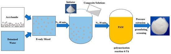For the anti-washout cement paste, a non-ionic polyacrylamide polymer (Shengyu Co., Ltd., Nanjing, Jiangsu, China) with a molecular weight of 10 million Dalton and PCA®-Type I (SBT, Nanjing, Jiangsu, China), which is known for its effectiveness as a polycarboxylic acid water reducer, were incorporated additives in our research. The specific aggregation process of PAM gel is shown in Figure 17 and is as follows: (1). Mix acrylamide (AM) and deionized water in a ratio of 1:5 according to the formula, and transfer to the dissolution tank. Stir until the raw materials are thoroughly and uniformly mixed. (2). After cooling the dissolution tank, pump the mixture into the reaction kettle for the polymerization reaction. (3). After purging with nitrogen for 40 min, add the initiator, azobisisobutyronitrile (AIBN), along with other composite solutions prepared with chain transfer agents, complexing agents, reducing agents, a first-stage oxidant, a second-stage oxidant, and auxiliary reducing agents. (4). After continuously introducing nitrogen for 30 min, stop and let the polymerization reaction proceed for 4–5 h to obtain the polymer colloid. (5). Open the compressed air inlet valve and use compressed air at 0.2 to 0.3 MPa to push out the material, completing the discharge in about 30 min. (6). Finally, proceed with cutting, granulating, drying, crushing, and screening to obtain non-ionic polyacrylamide.