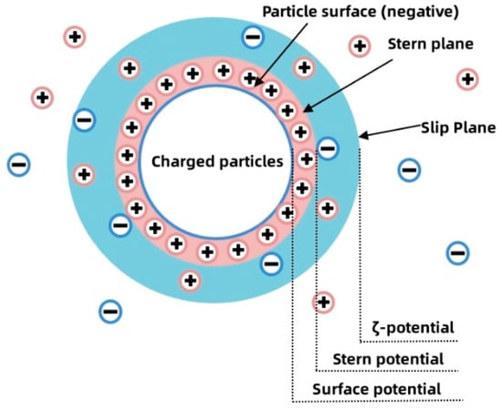 The concept of cationic particle zeta potential is showcased in Figure 18. Electrophoretic light scattering combines laser light scattering with microelectrophoresis [39]. When a laser beam passes through the electrophoresis cell, the Brownian motion of cement particles in the cell causes shifts in laser frequency and phase. These shifts are directly proportional to the velocity of charged particles and can be used to determine particle electrophoretic velocity and subsequently calculate the zeta potential value. Conforming to the ISO-13099-2 standard [40], electrophoretic light scattering was employed for zeta potential testing of PAM slurry. Since the previous research has established that 0.6% PAM is its optimal dosage [9,21], PAM content gradients of 0.0%, 0.3%, 0.6%, and 0.9% by cement mass were tested for their effects on the change in slurry potential. A well-mixed PAM slurry was placed in the Malvern Zetasizer Nano ZS 90 analyzer (Malvern Panalytical, Shanghai, China) and stirred at 350 r/min for 2 min before measurement, and each composition was subjected to three repeated tests to obtain accurate data.
