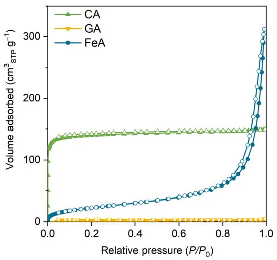 N2 adsorption–desorption isotherm of the carbon aerogel (CA), graphene aerogel (GA), and iron aerogel (FeA). Colored and empty marks correspond to the adsorption and desorption branches, respectively.