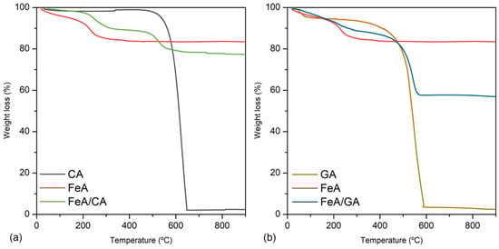 Thermogravimetric analysis measured in air for CA, FeA, and FeA/CA (a), and for GA, FeA, and FeA/GA (b).