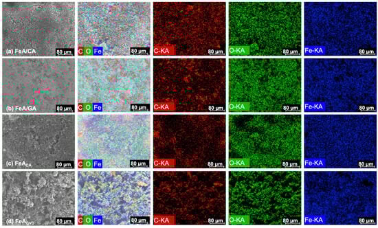 SEM images and energy-dispersive X-ray (EDX) mapping analysis of composite FeA/CA (a), composite FeA/GA (b), FeA doped with citric acid (c), and FeA doped with toluene by CVD (d).