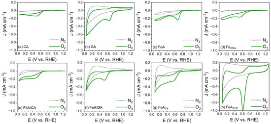 CVs measured in N2- and O2-saturated 0.1 M KOH electrolyte for the carbon aerogel (a), the graphene aerogel (b), the iron aerogel (c), the iron particles (d), the iron–carbon aerogel composite (e), the iron–graphene aerogel composite (f), the iron aerogel functionalized with citric acid (g), and the iron aerogel functionalized by chemical vapor deposition (h).