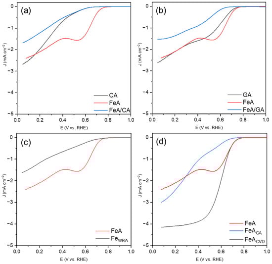 LSVs at 1600 rpm in KOH 0.1 M after subtracting the N2-saturated solution results from those obtained in an O2-saturated solution, measured with a scan rate of 5 mV s−1 for (a) CA, FeA, and the composite FeA/CA, (b) GA, FeA, and the composite FeA/GA, (c) iron samples FeA and FeWRA, and (d) FeA and the doped samples FeACA and FeACVD.