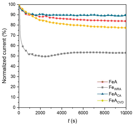 Chronoamperometries of FeA, FeAWRA, FeACA, and FeACVD after 10,000 s, applying a voltage of 0.4 V (RHE).